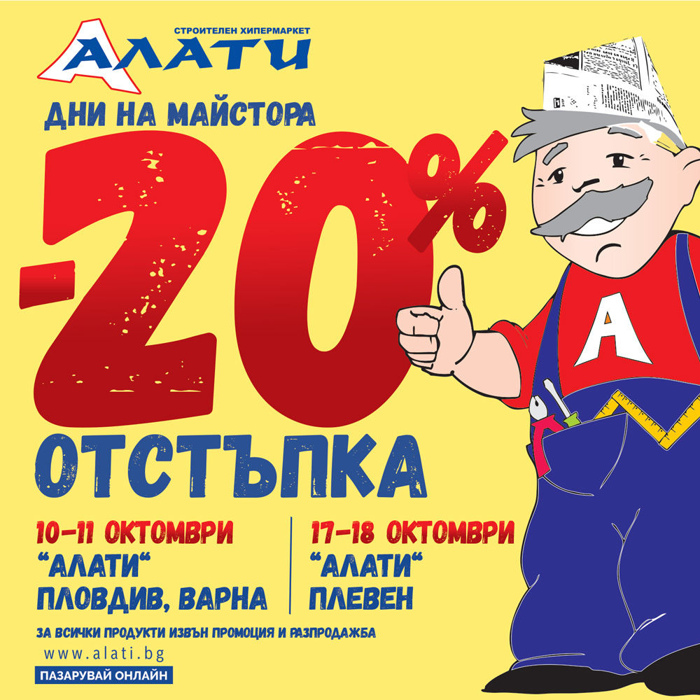 На 10 и 11 октомври в строителни хипермаркети „Алати“ – Пловдив и Варна, както и на 17 и 18 октомври в „Алати“ – Плевен, ще се проведат специалните „Дни на майстора“. Посетителите ще могат да се възползват от 20% отстъпка на всички продукти извън акции.