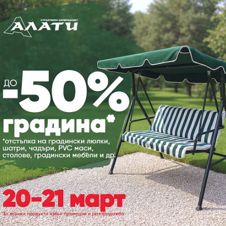 С настъпването на пролетта идва и моментът да подготвим градината, двора или терасата за топлите дни. Строителни хипермаркети Алати дават отлична възможност това да стане на изключително изгодни цени по време на специалната двудневна кампания.