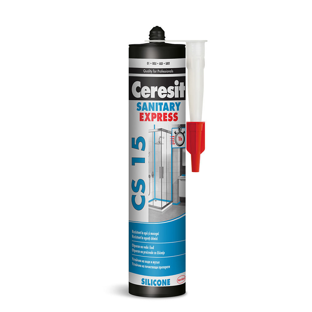 Ceresit CS 15 Express е универсален еднокомпонентен силиконов уплътнител, който е изключително подходящ за хигиенични или други конструктивни уплътнения. Санитарният силикон Ceresit CS 15 Express се втвърдява бързо от влажността на въздуха като става водоустойчив след 2 часа. Има добра адхезия към различни непорести субстрати като стъкло, остъклени керамични плочки, анодизиран алуминий и метал и има отлична устойчивост на свиване, напукване и промяна на цвета. Силиконът е устойчив на мухъл, плесени, озон, ултравиолетово лъчение, екстремни температури, време и стареене.