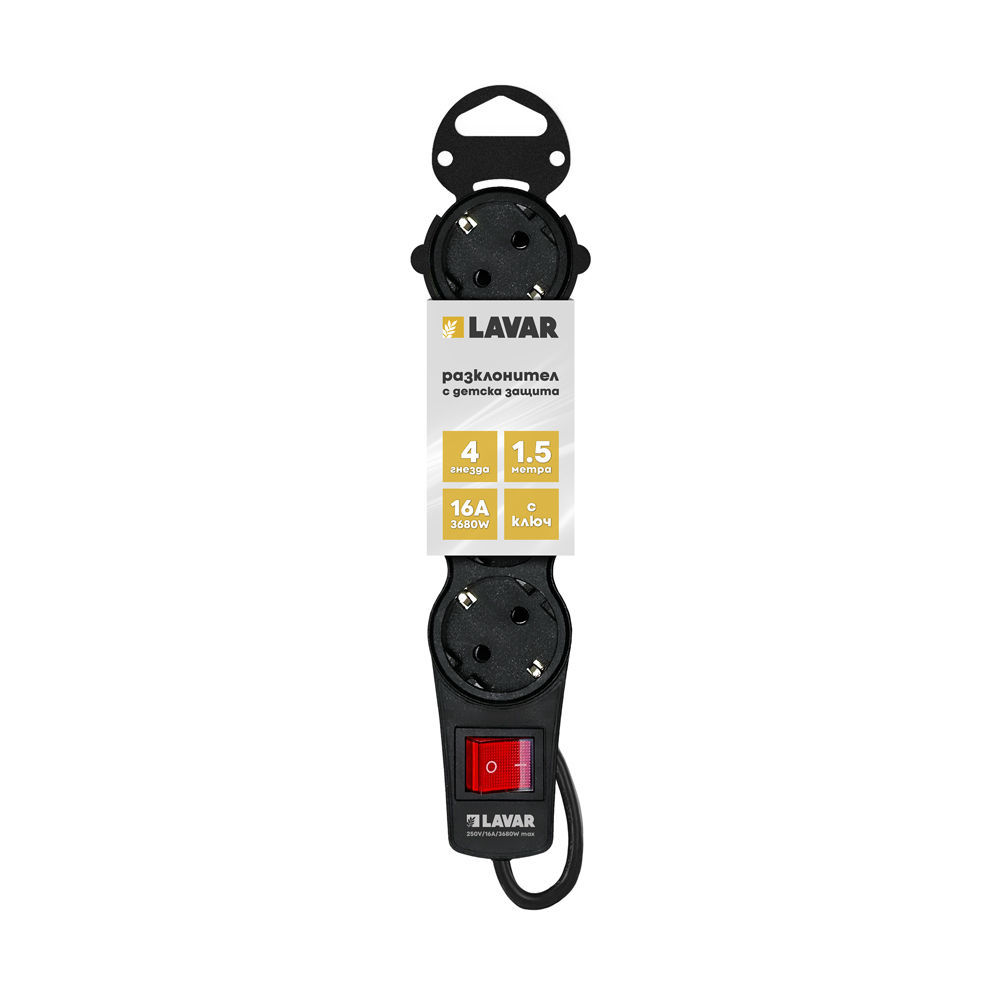 Разклонител Lavar GR415B - 4-ка с ключ - 1.5м - черен
